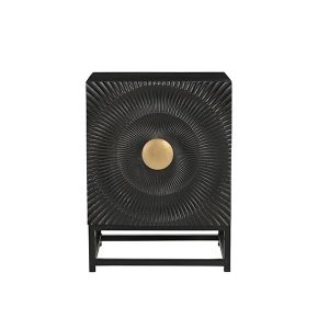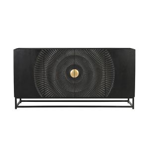 Elegantne mustast mangopuidust valmistatud kapp ühendab endas moodsa disaini, looduslikud materjalid ja kunstilised detailid, luues mööblieseme, mis on nii praktiline kui ka esteetiliselt meeldiv. Kapi eripäraks on uste kunstiline ümar nikerdatud muster. Keskel olev kuldne metallkäepide annab luksusliku aktsendi ja paistab stiilselt silma tumeda puidu taustal. Kapil on tugev metallraam. Uste taga peitub avar riiul asjade paigutamiseks. Mitmekülgne kapp sobib elu-, magamis,- või söögituppa.
